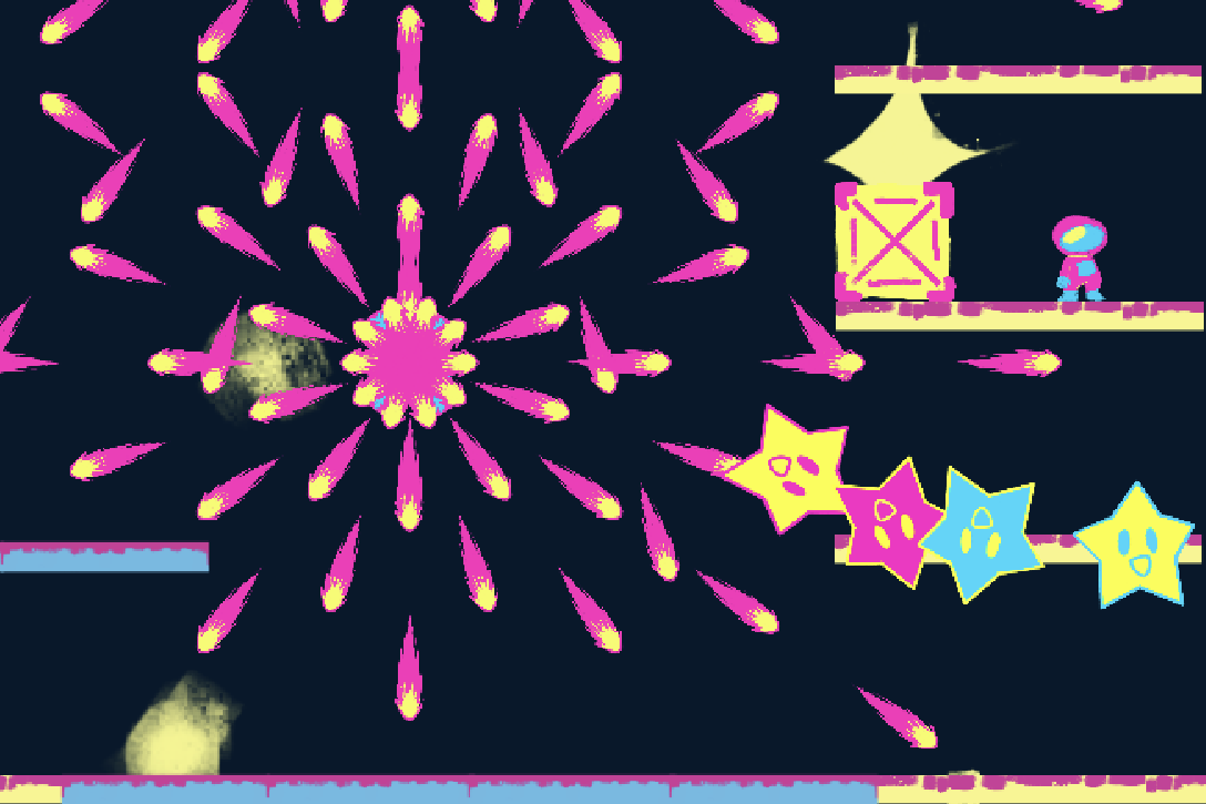 This game was created for the prompt 6 players or more. One player takes the role of the astronaut while the other players are floating stars. The astronaut must climb upwards with the help of the stars who can push boxes, block fireballs, and more. Levels were created for 2, 4, and 6 player modes.